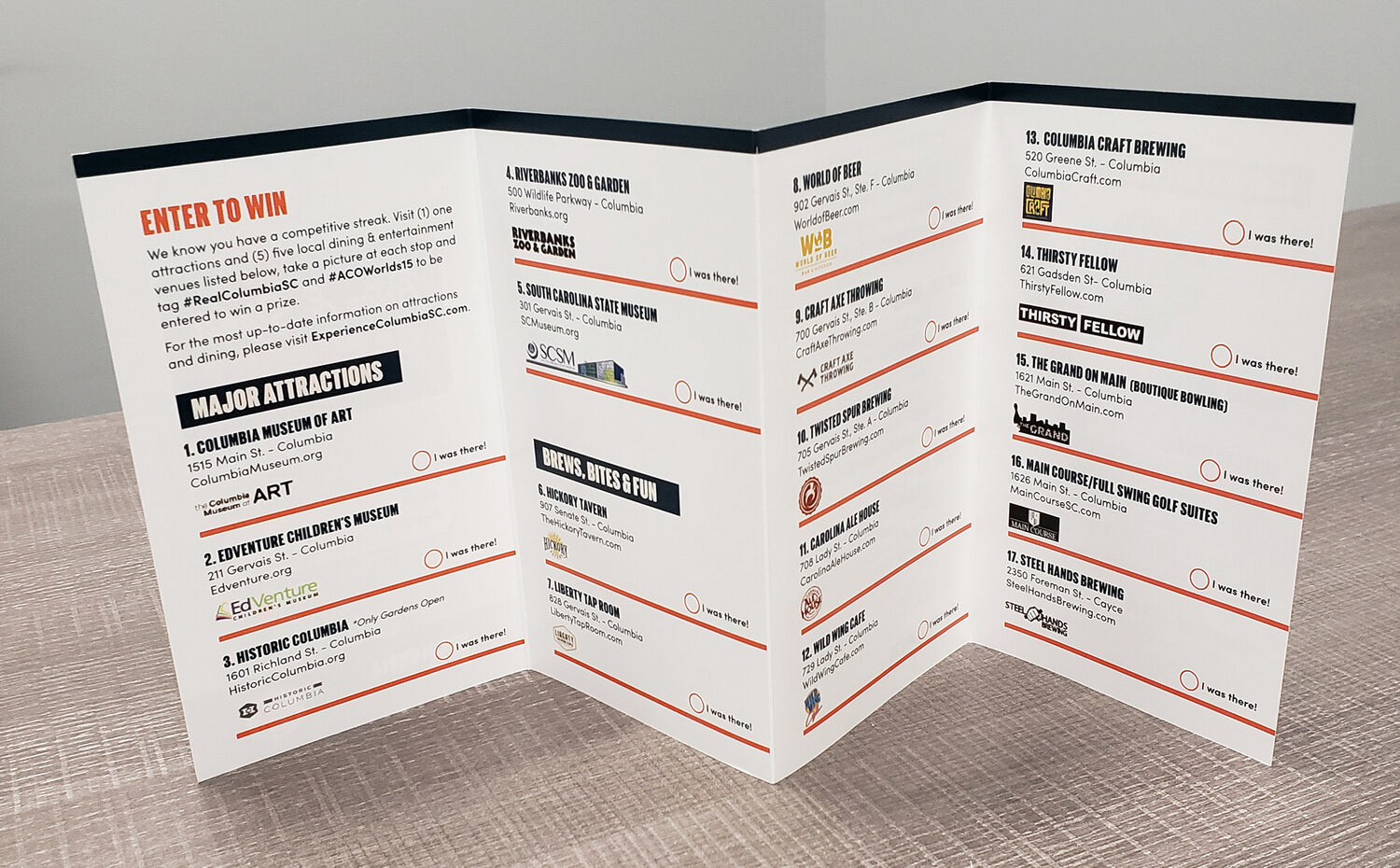 As a way to encourage attendees of the Cornhole Association Worlds Championship to get out an enjoy their time in Columbia SC, this restaurant passport was created with recommendations from the event planner. Each attendee that visited five places could be entered in a drawing for a giveaway. It follows our organization’s branding, lists the event schedule of the tournament, a map of each location to help show vicinity, and lists contact information for each location.