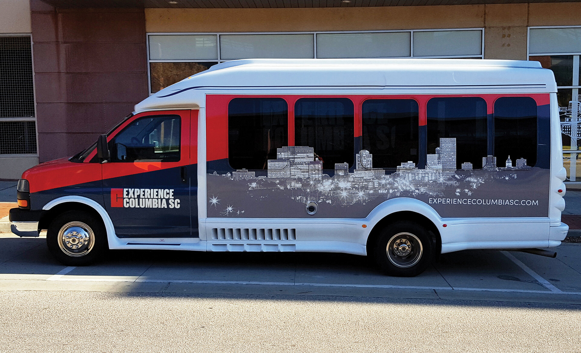 Experience Columbia SC leases a shuttle van for the meeting and event planners that book with them. As a complimentary benefit of booking with them they offer this shuttle for the event attendees. To increase brand awareness, we wrapped the van in brand colors with a halftone image of the Columbia SC skyline. By converting the image to halftone, I was able to increase the image size without losing printing quality of the image. The halftone effect also gave the design an artistic look, which is one of the brand messaging as the city as a unique and large art community.